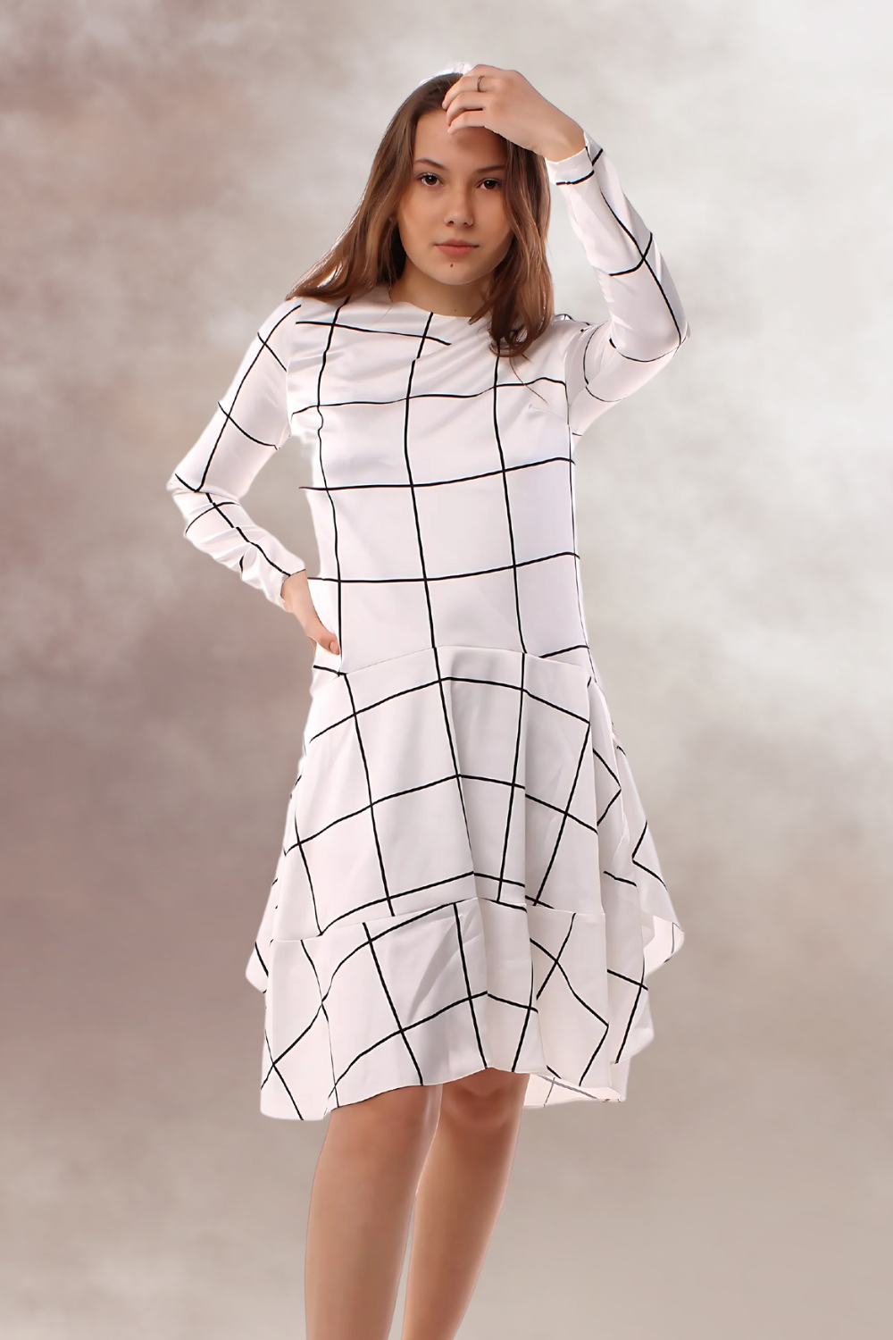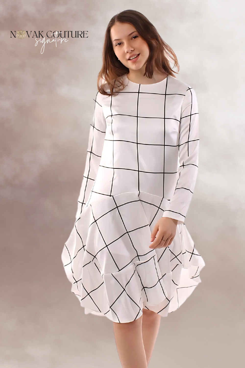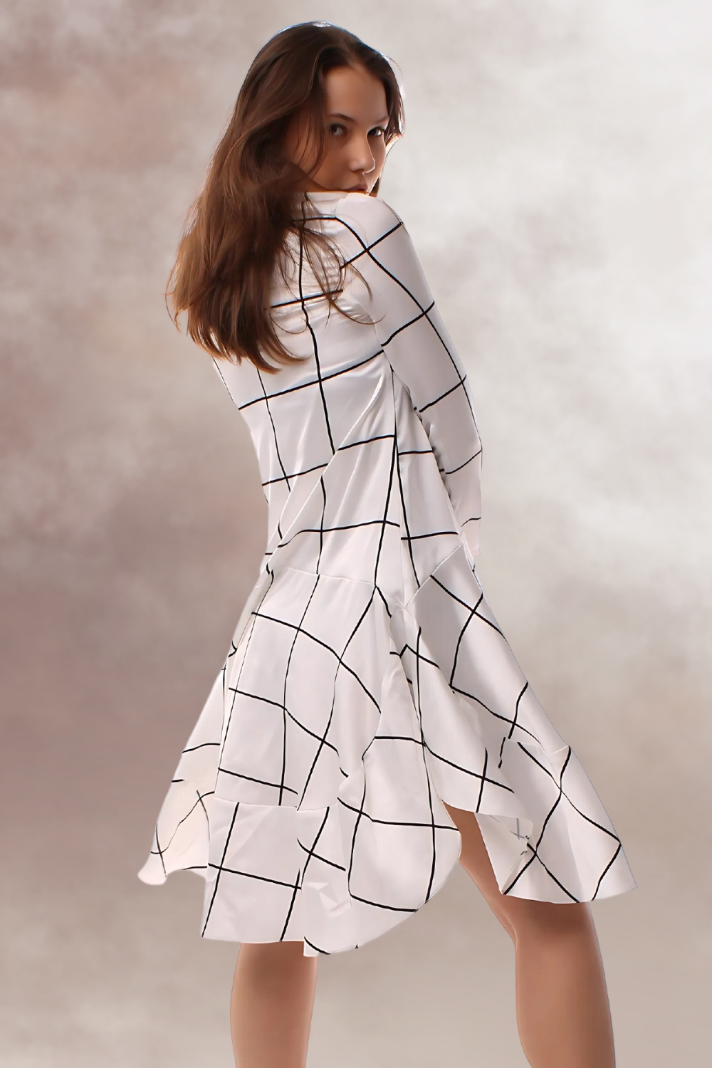 Teylor este o rochie versatila, usoara, vesela! Pur si simplu te simti sexy, libera si plina de viata! Croiala dreapta minimalista este echilibrata de terminatia asimetrica care ofera volatilitate si lejeritate in miscare. Confectionata din satin cu imprimeu carouri alb-negru, guler rotund, cu inchidere in nasturi la spate, rochia Teylor este potrivita pentru orice tip de silueta.